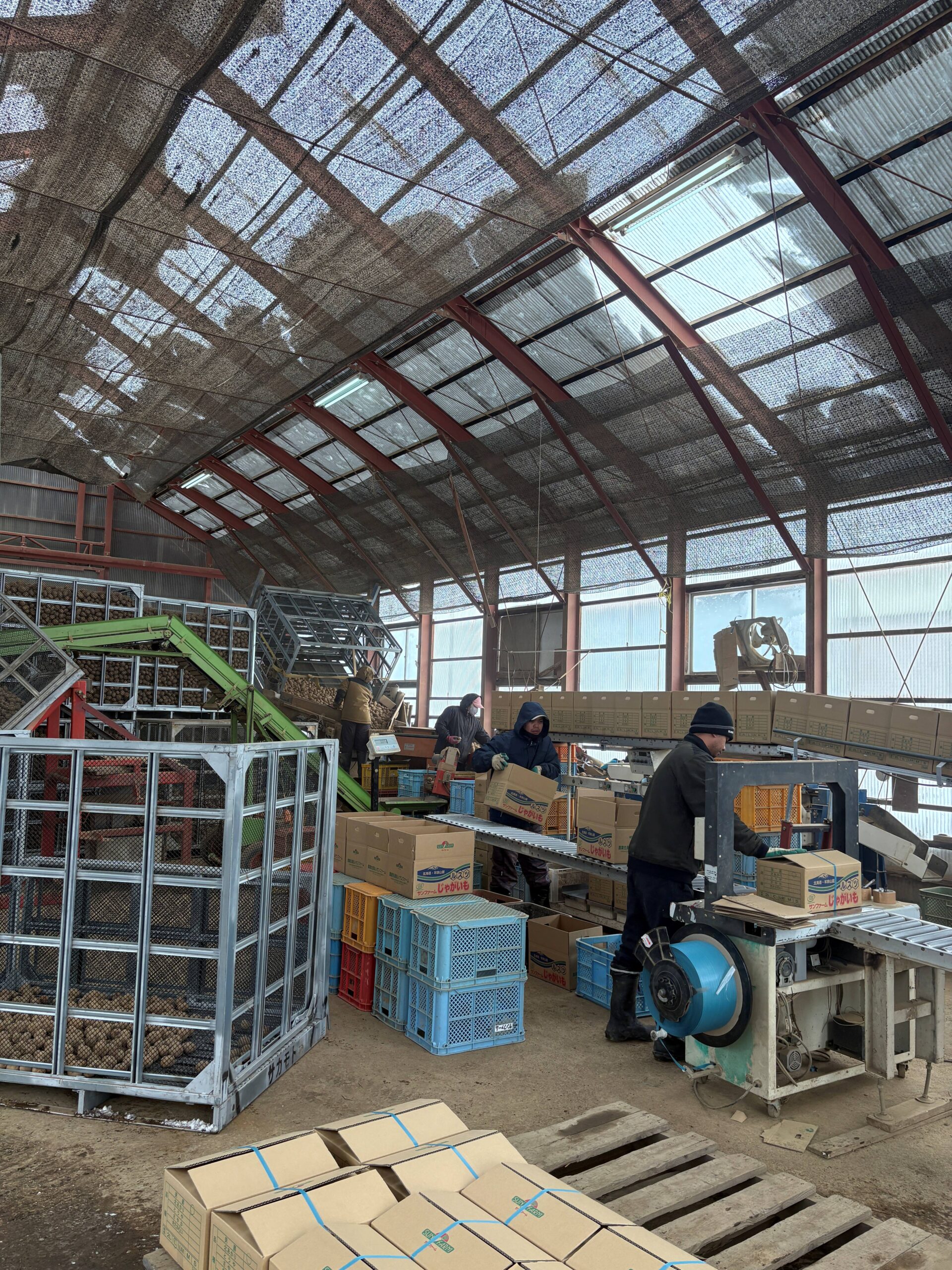寒波の中でも元気にじゃがいもを箱詰めしています。
